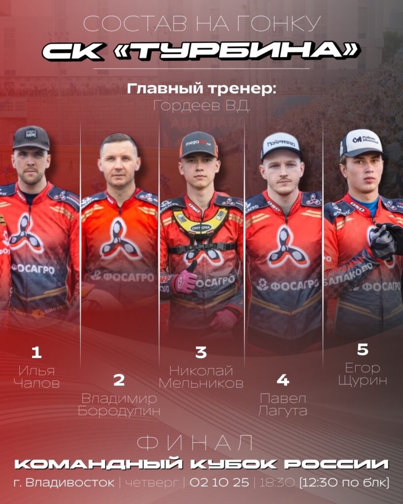 «Турбина» из Балаково поборется за Кубок России по спидвею. Защищать честь клуба будут: капитан команды Илья Чалов, Владимир Бородули, Николай Мельников, Павел Лагута и Егор Щурин. Главный тренер команды — Валерий Гордеев.
