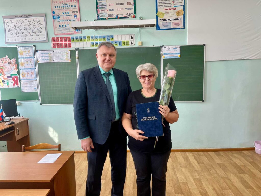 Владимир Земсков в школе встретился с завхозом Верой Денисовой, чтобы вручить ей Почётную грамоту от Председателя Саратовской областной Думы за многолетний добросовестный труд и высокий профессионализм.