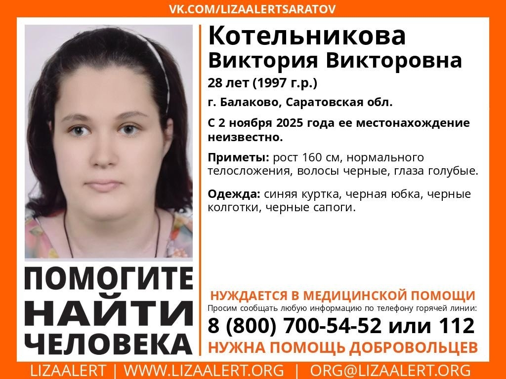 Пропавшую 28-летнюю женщину разыскивают в Балаково. Продолжаются поиски Виктории Котельниковой, которая пропала 2 ноября 2025 года. По информации поискового отряда «ЛизаАлерт», девушка нуждается в медицинской помощи.