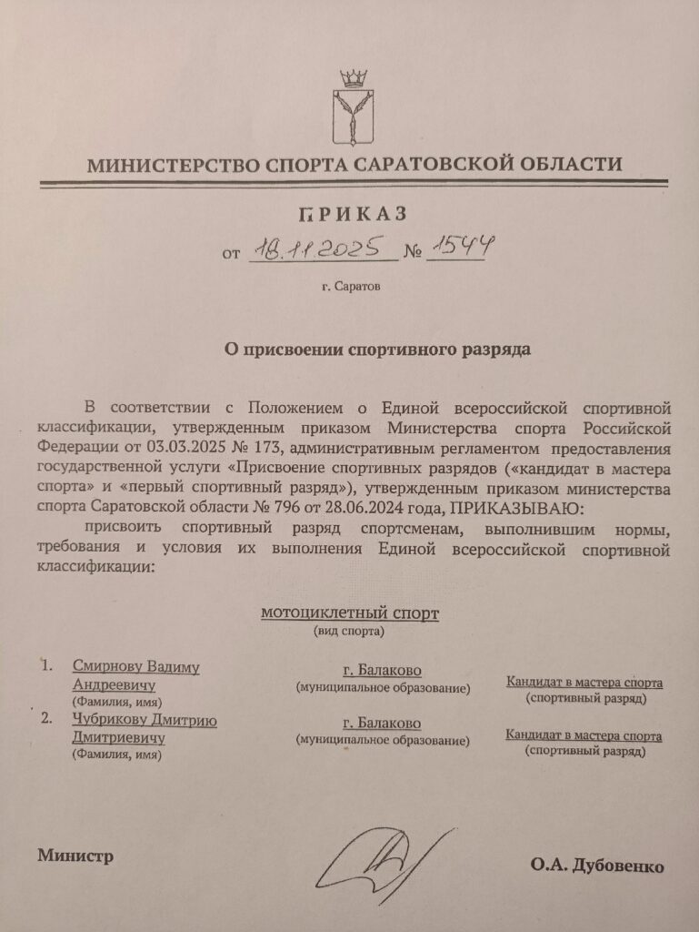 Балаковские гонщики выполнили норматив КМС. Двое воспитанников балаковской спортивной школы «Турбина» получили звания кандидатов в мастера спорта. Высокого звания удостоены гонщики Дмитрий Чубриков и Вадим Смирнов.
