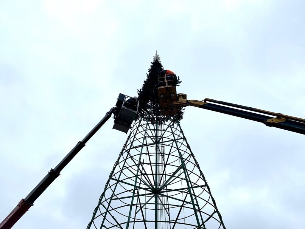 Вчера завершился монтаж металлического основания, а сегодня рабочие приступили к его «озеленению» — креплению искусственных еловых лап. Уже сверху, как маяк для всех, кто ждет чуда, горит нарядная Вифлеемская звезда.