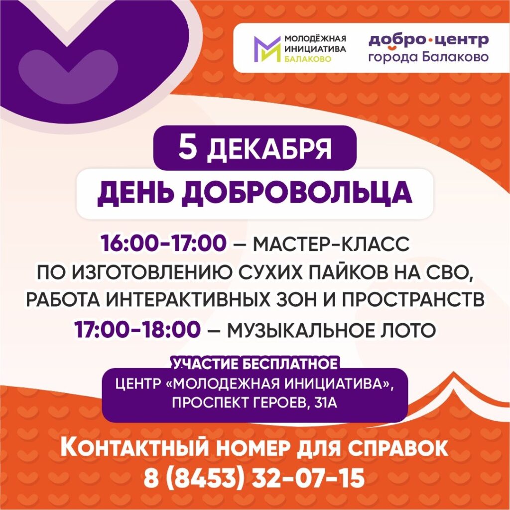 День волонтёра отметят в Балаково. Мероприятие начнётся в 16:00 по адресу: проспект Героев, 31А. Дополнительную информацию можно получить по телефону: 8 (8453) 32-07-15.
