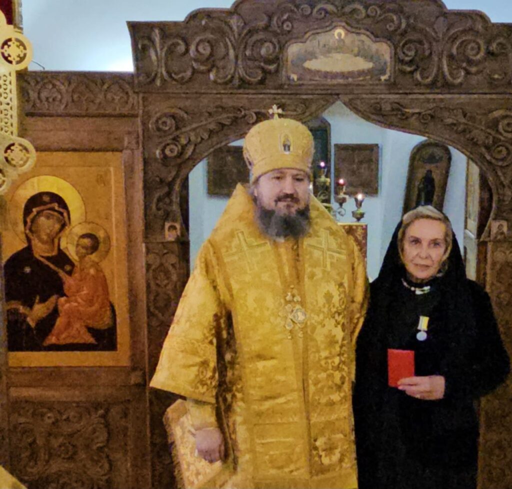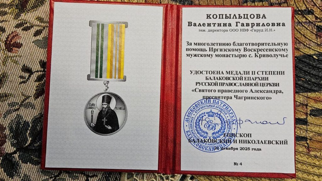 Валентина Гавриловна Копыльцова удостоена медали II степени Балаковской Епархии Русской Православной Церкви «Святого праведного Александра, пресвитера Чагринского» за многолетнюю благотворительную помощь Иргизскому Воскресенскому мужскому монастырю с. Криволучье.