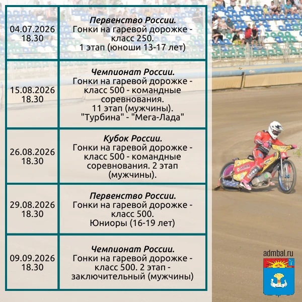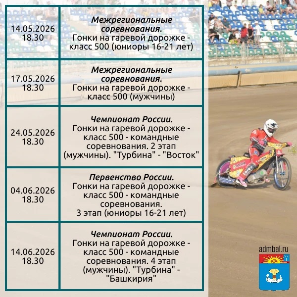 Стала известна дата старта спидвейного сезона в Балаково. Болельщики могут начинать готовить флаги и шарфы — утверждено расписание соревнований по спидвею на стадионе «Труд» в 2026 году. Первый старт сезона пройдёт уже 14 мая: в полседьмого вечера на гаревую дорожку выйдут юниоры 16–21 года в классе 500. Через три дня, 17 мая, в это же время состоятся межрегиональные соревнования среди мужчин.