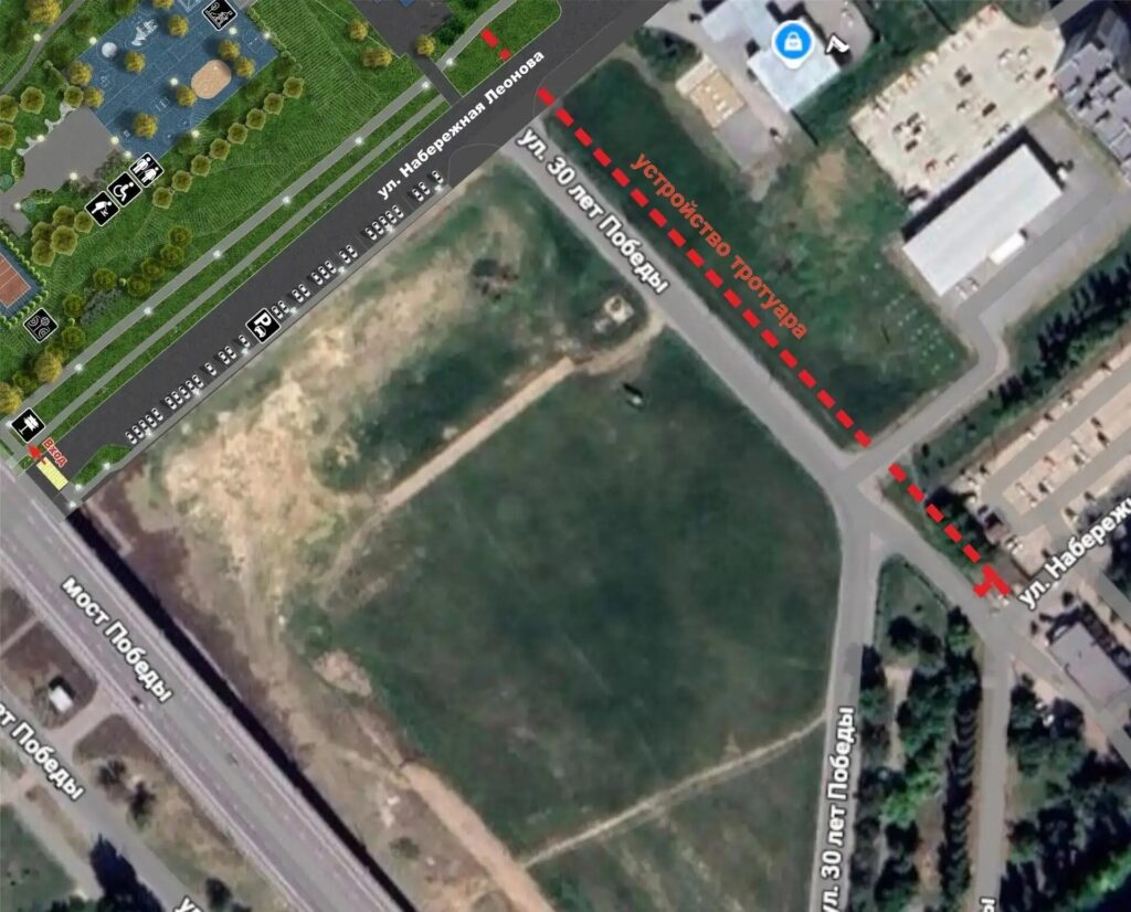 Тротуар протянется от дублёра набережной Леонова вдоль автомобильной дороги и плавно выведет к воде, где обустроят места для отдыха. Вдоль всего пути смонтируют освещение, чтобы возвращаться домой по красиво освещённой аллее было комфортно даже поздним вечером. Новая набережная таким образом объединится с тротуаром на улице 30 лет Победы, а оттуда через сквер можно будет попасть в Центральный парк.